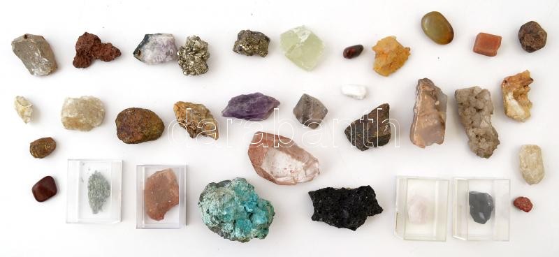 Leírás: 33 db ásvány, némelyik gyűjtői dobozban