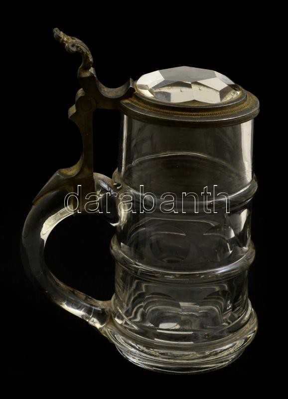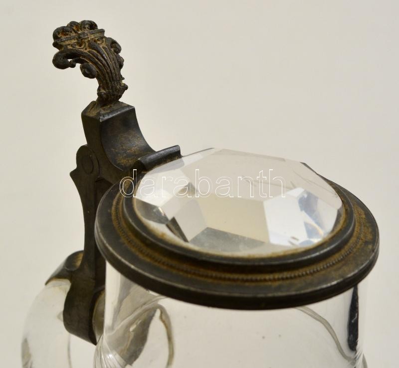 Leírás: cca 1900 Ón tetős kis fújt söröskorsó, metszett kristályüveggel, m:15,5 cm
