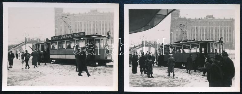 Leírás: 1942 Budapest, Villamosok a Széll Kálmán téren, 2 db fotó, 4,5×6 cm