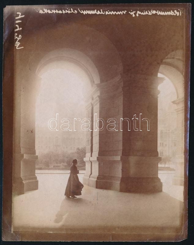 Leírás: cca 1910 Az Országház sziluettje a Földművelésügyi Minisztérium épületének árkádjai felől fotózva, fotó, Szőnyi Lajos felvétele, szakadt, 9x12 cm