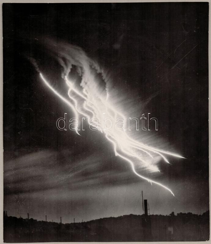 Leírás: cca 1944 Brukner Zoltán: Fények a háborúból, ejtőernyős világító bombák, feliratozott vintage fotóművészeti alkotás, 31x27 cm