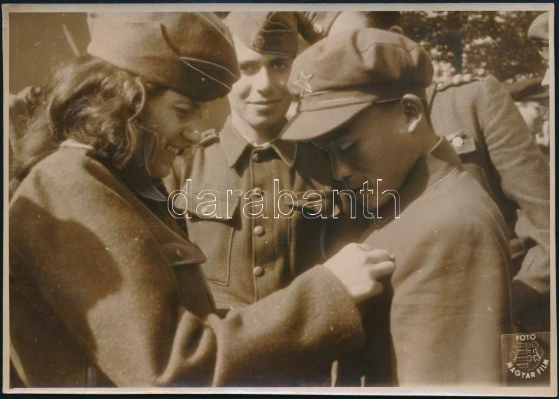 cca 1947 Görög és spanyol partizánok találkozása a kínai küldöttekkel Budapesten, Magyar Film Fotó, megjelent a Szabad Szó című újságban, pecséttel jelzett, feliratozott, 12×17 cm
