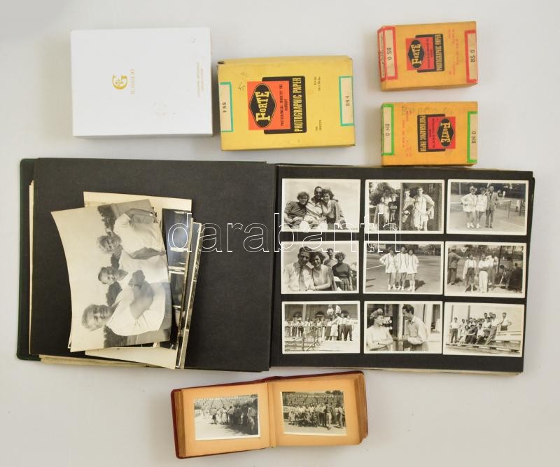 cca 1950 és 1970 között készült fényképek Bárdóczy Klára (1937-1995) tizenháromszoros magyar bajnok teniszező életéről, versenyeiről, sporttársakról, stb., két albumban és sok facér fénykép dobozokban, cca 505 db vintage fotó + 9 db oklevél, 13x18 cm és 4x5 cm között