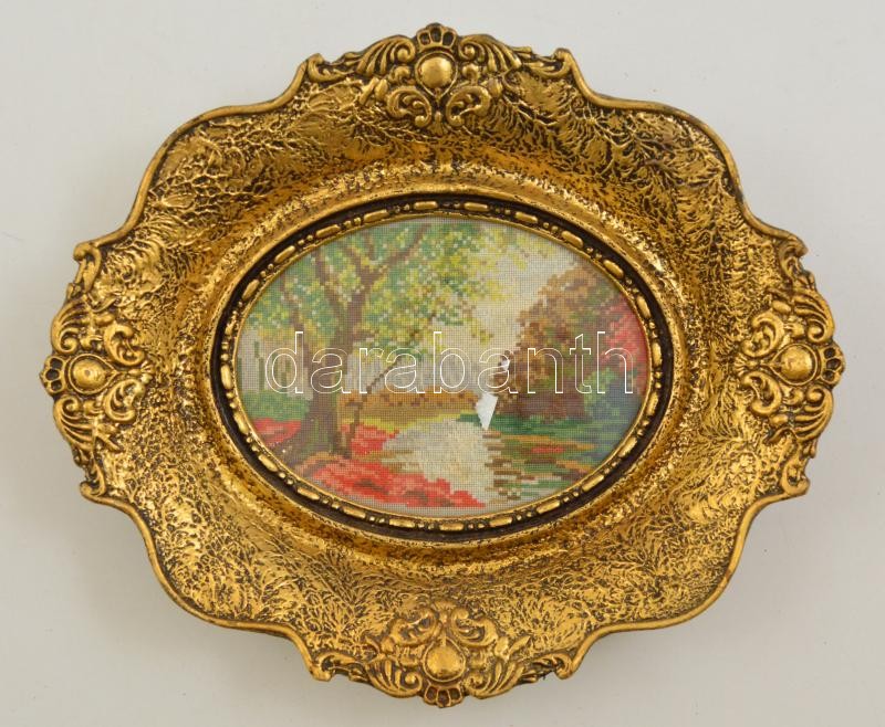 Leírás: Neobarokk stílusú ovális gipsz képkeret, gobelin képpel, belső:12,5×17 cm, külső:25×29 cm, jó állapotban