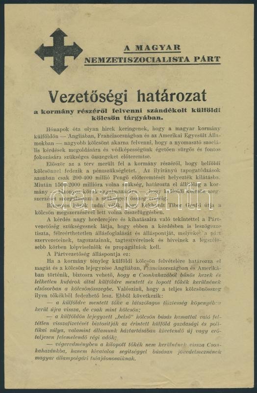 1938 Magyar Nemzetiszocialista Pár vezetőségi határozata. Tiltakozás k... https://www.darabanth.com/hu/337-Gyorsarveres/337.0/Mutargy-papirregiseg-egyeb/Nyomtatvanyok~500029/1938-Magyar-Nemzetiszocialista-Par-vezetosegi-hatarozata-Tiltakozas-kulfoldi-kolcsonfelve~II1894766