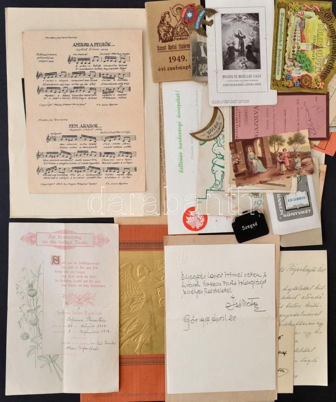 cca 1920-1950 Vegyes papírrégiség tétel, kb. 40 db, közte italcímkék, szentképek, jegyek és bérletek, fotó, távirat, Budapesti Székesfőváros Elektromos Műveinek áramszolgáltatási feltételei, az ár- és díjszabásának kivonata, ...stb.