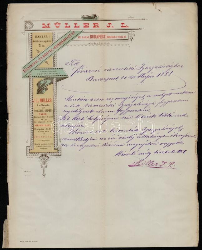 1888 Budapest,Müller J. L. illatszer és pipere szappan gyár, díszes fe... https://www.darabanth.com/hu/337-Gyorsarveres/337.0/Mutargy-papirregiseg-egyeb/Okmanyok~500017/1888-Budapest-Muller-J-L-illatszer-es-pipere-szappan-gyar-diszes-fejleces-level~II1887835