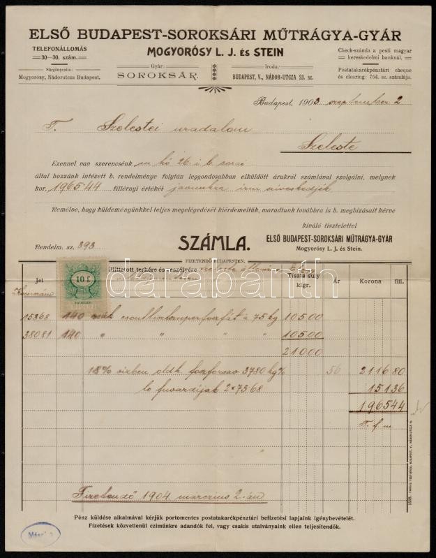 Leírás: 1903 Budapest, Első Budapest-Soroksári műtrágya-gyár Soroksár, díszes fejléces számla, okmánybélyeggel