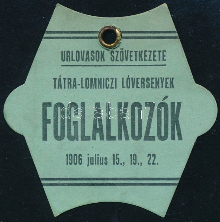 Leírás: 1906 Úrlovasok Szövetkezete tátralomnici lóverseny foglalkozók jegy, 6x6 cm