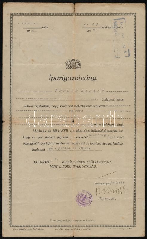 1918 Iparigazolvány budapesti cipész részére https://www.darabanth.com/hu/337-Gyorsarveres/337.0/Mutargy-papirregiseg-egyeb/Okmanyok~500017/1918-Iparigazolvany-budapesti-cipesz-reszere~II1894996
