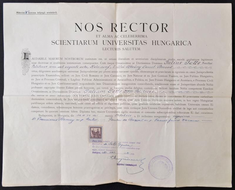 Leírás: 1920 Budapesti Kir. M. Tudományegyetem államtudományi doktori oklevelének másolata, 5 kr. okmánybélyeggel, pecséttel.