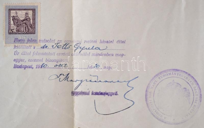 1920 Budapesti Kir. M. Tudományegyetem államtudományi doktori oklevelé... https://www.darabanth.com/hu/337-Gyorsarveres/337.0/Mutargy-papirregiseg-egyeb/Okmanyok~500017/1920-Budapesti-Kir-M-Tudomanyegyetem-allamtudomanyi-doktori-oklevelenek-masolata-5-kr-okma~II1871823