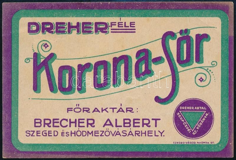 cca 1920 Szeged-Hódmezővásárhely, Brecher Albert - Dreher féle Korona-... https://www.darabanth.com/hu/337-Gyorsarveres/337.0/Mutargy-papirregiseg-egyeb/Reklam~500021/cca-1920-Szeged-Hodmezovasarhely-Brecher-Albert-Dreher-fele-Korona-sor-cimke-Szeged-Szeg~II1888379