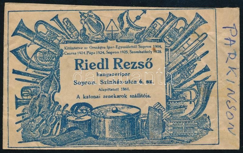 cca 1930 Sopron, Riedl Rezső hangszerkészítő dekoratív papírtasakja, 6... https://www.darabanth.com/hu/337-Gyorsarveres/337.0/Mutargy-papirregiseg-egyeb/Reklam~500021/cca-1930-Sopron-Riedl-Rezso-hangszerkeszito-dekorativ-papirtasakja-6-5C39711-cm~II1892949