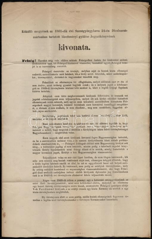 1861 Küküllő vármegye Dicsőszentmártonban tartott bizottmányi ülés jegyzőkönyvének kivonata a királyhoz szóló folyamodvánnyal, melyben kifogásolják, hogy az 1861-es országgyűlésre a király az erdélyi megyék küldötteit nem hívta meg és síkra szállnak Erdély Magyarországhoz csatolása mellett az 1848-as törvények szellemében. Nyomtatványként elküldve.