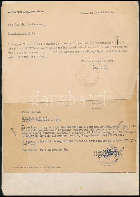 1957-1958 Vas Zoltán (1903-1983) író, 56-os államminiszter részére megküldött két hivatalos levél: az egyikben az MSZMP KB értesíti, hogy Romániából való hazatérte után fognak foglalkozni a pártba való átvételéről, 1956-os szerepének megvizsgálása után. A másikban az ügyészség értesíti, hogy a Népköztársaság Elnöki tanácsa megszüntette az ellene a népi demokratikus államrend megdöntésére irányuló szervezkedésben való részvétel miatt indított büntetőeljárást.
