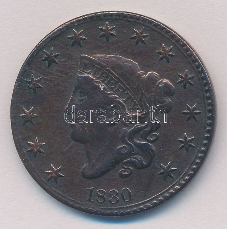 ... https://www.darabanth.com/hu/337-Gyorsarveres/337.0/Numizmatika/Kulfoldi-fem-es-ezustpenzek~1500014/Amerikai-Egyesult-Allamok-1830-1c-Cu-T2--USA-1830-1-Cent-Cu-CVF-Krause-KM2345~II1892878