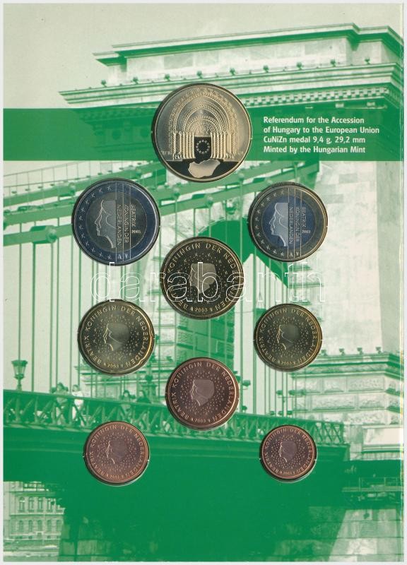 Netherlands 2003. 1 Cent - 2 Euro (8xdiff) + "Referendum for the Accession of Hungary to the European Union" metal commemorative medal (29,2mm), "Hungarian National Bank Information Set" coin set in cardboard case, Hungarian and English language C:BU