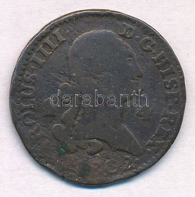 Spain 1802. 4... https://www.darabanth.com/hu/337-Gyorsarveres/337.0/Numizmatika/Kulfoldi-fem-es-ezustpenzek~1500014/Spanyolorszag-1802-4m-Cu-IV-Karoly-T2-3-Spain-1802-4-Maravedis-Cu-Charles-IV-CVF-F-Kra~II1893720