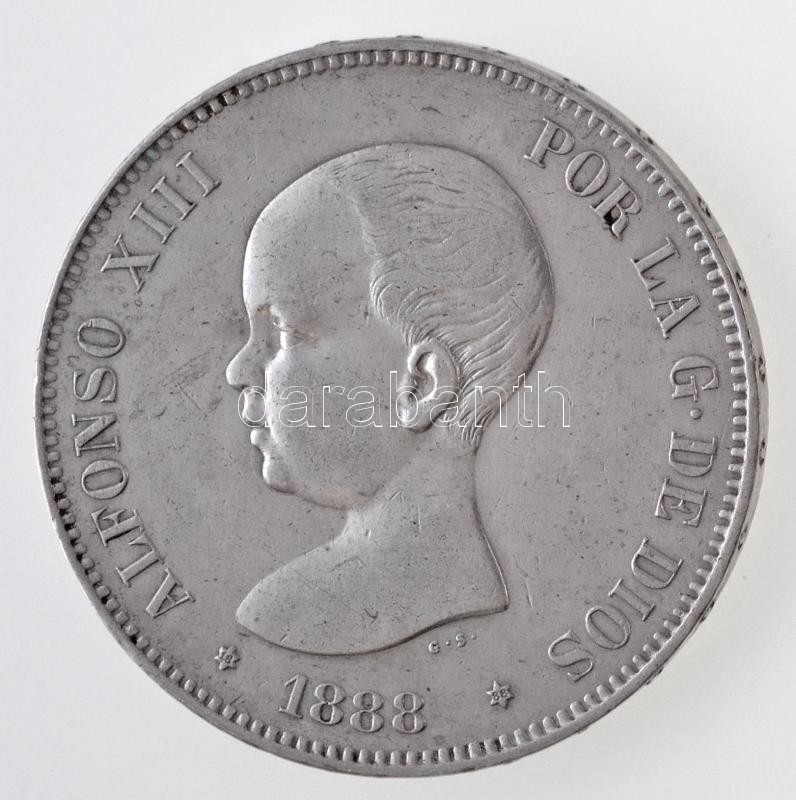 Spain 18... https://www.darabanth.com/hu/337-Gyorsarveres/337.0/Numizmatika/Kulfoldi-fem-es-ezustpenzek~1500014/Spanyolorszag-1888MP-M-5P-Ag-XIII-Alfonz-T1-2-Spain-1888MP-M-5-Pesetas-Ag-Alfonso-XIII-CAU~II1893758