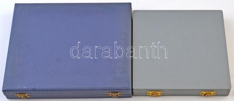 1986. A Középületépítő Vállalat névre szóló, egyoldalas Br plakettje harminc év munka után, hátoldalán gravírozva, eredeti dísztokban (100x121mm) + 1994. "Nívódíj" névre szóló, egyoldalas plakett, hátoldalon gravírozva, dísztokban (98mm) T:1