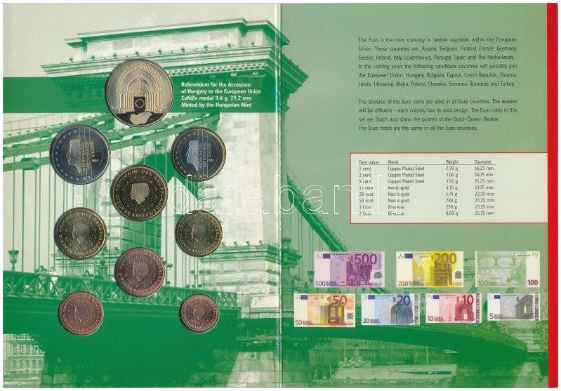 Leírás: 2003. 1c + 2c + 5c + 10c + 20c + 50c + 1EUR + 2EUR próbaveretek + "Népszavazás Magyarország Európai Uniós csatlakozásáról" rézötvözetű emlékérem első hivatalos információs készlet díszkiadásban T:1
