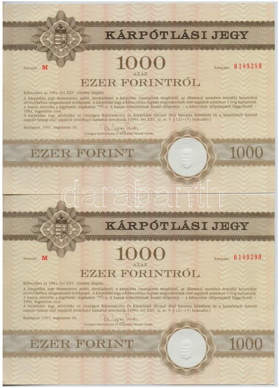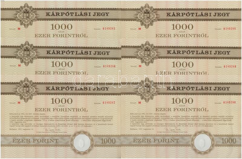Leírás: Budapest 1991. "Országos Kárrendezési és Kárpótlási Hivatal" kárpótlási jegye 1000Ft-ról (6x), "M" sorozat, sorszámkövetők T:I-
