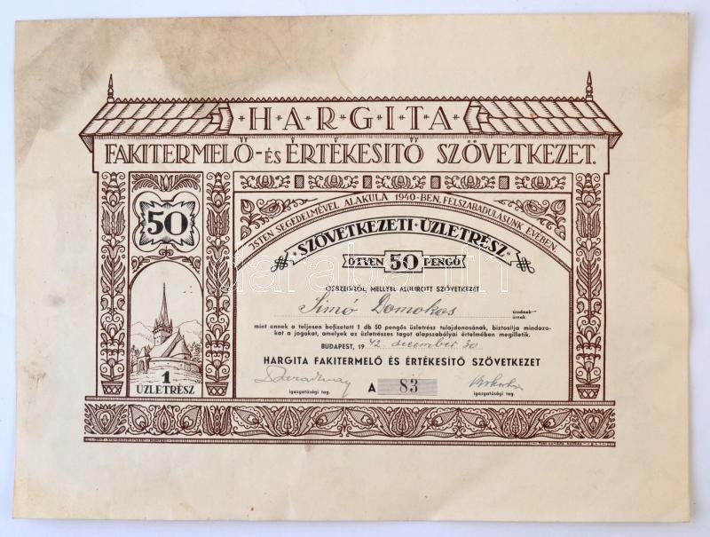 Leírás: Budapest 1942. "Hargita Fakitermelő- és Értékesítő Szövetkezet" névre szóló szövetkezeti üzletrész 50P-ről, szelvényekkel T:III