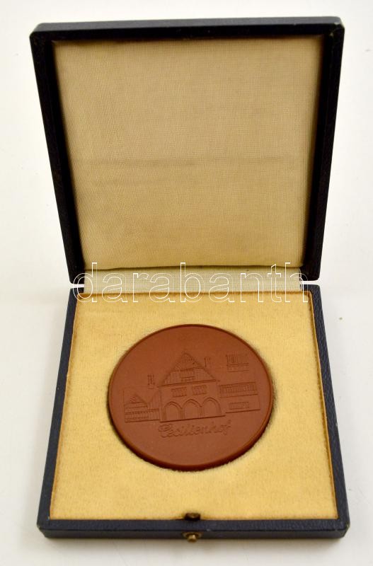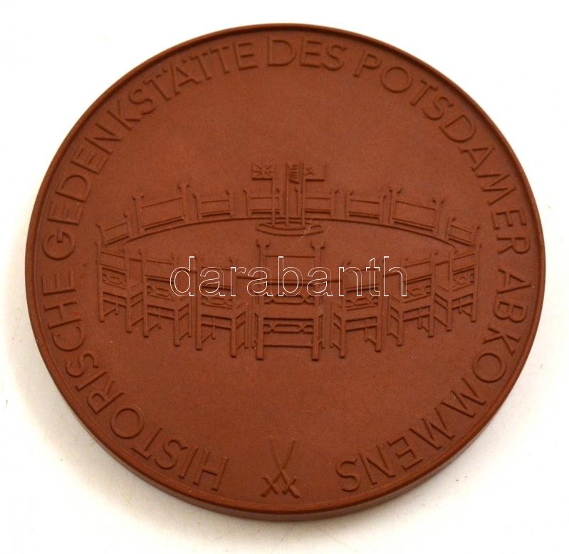 Leírás: "Cecilienhof -Historsche Gedenkstätte Potsdamer Abkommens" feliratú meisseni, máztalan kerámia plakett, tokban, d: 6 cm