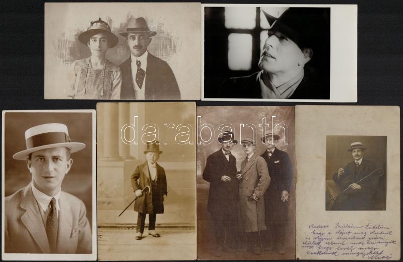 Leírás: 1912-1932 "Egy szalmakalap a Piccadillyn, 6 db kalapos férfiakat ábrázoló fotó, 14×9 cm