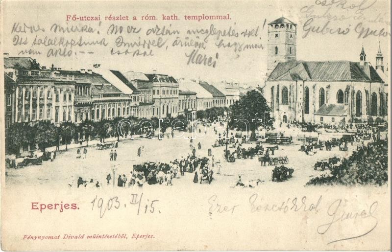 Leírás: 1903 Eperjes, Presov; Fő utca, Római katolikus templom, piac / main street, market, church