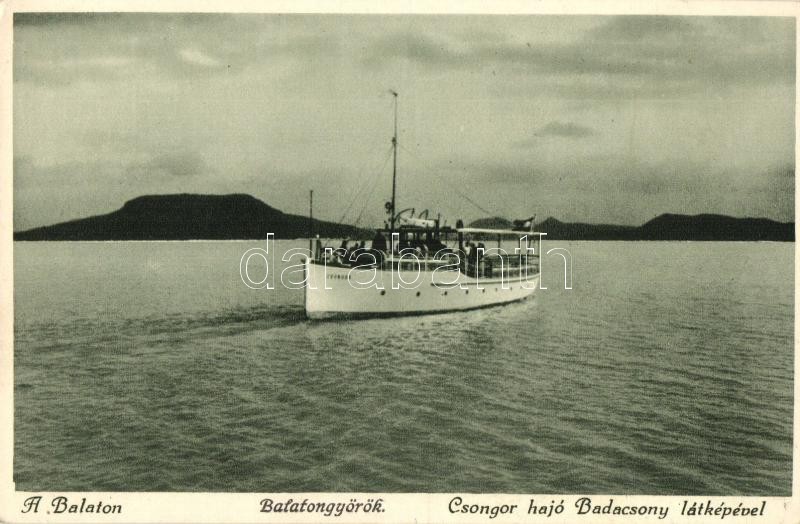 Balatongyörök, "Csongor" motoros személyhajó a Badacsony látképével https://www.darabanth.com/hu/338-Gyorsarveres/338.0/Kepeslapok/Magyarorszag~2000005/Balatongyorok-Csongor-motoros-szemelyhajo-a-Badacsony-latkepevel~II1896395