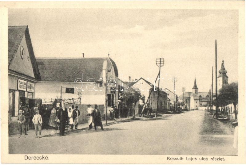 Leírás: Derecske, Kossuth Lajos utca, Római katolikus és Református templomok, dohánybolt, hentes üzlete. Kiadja Truszka Károly