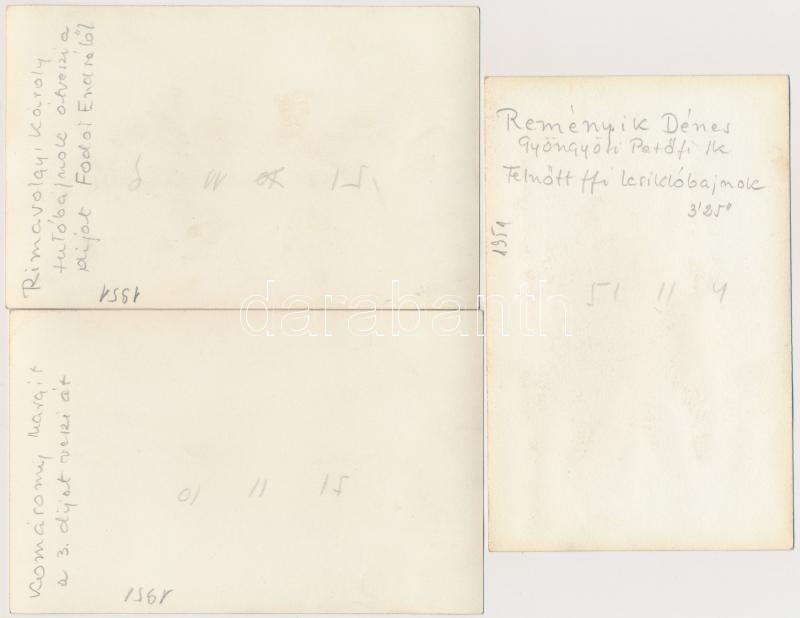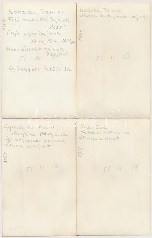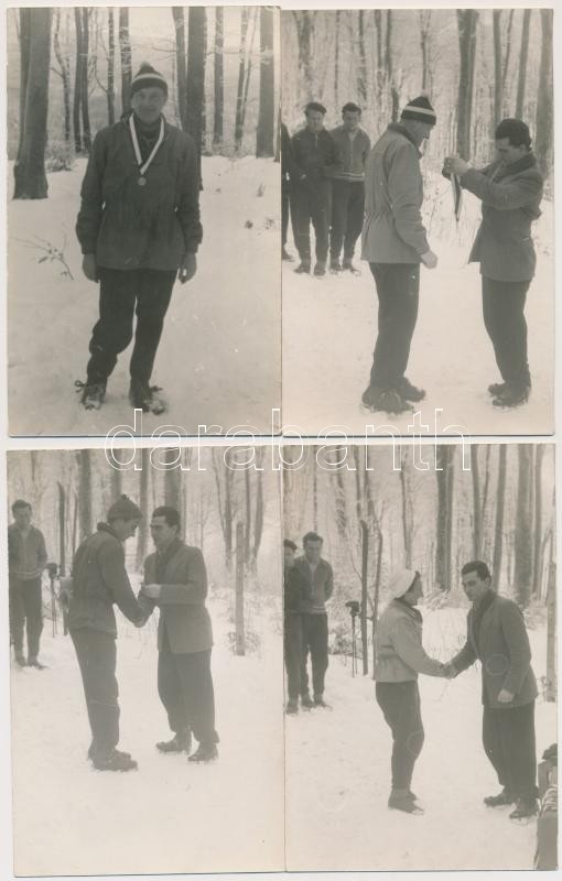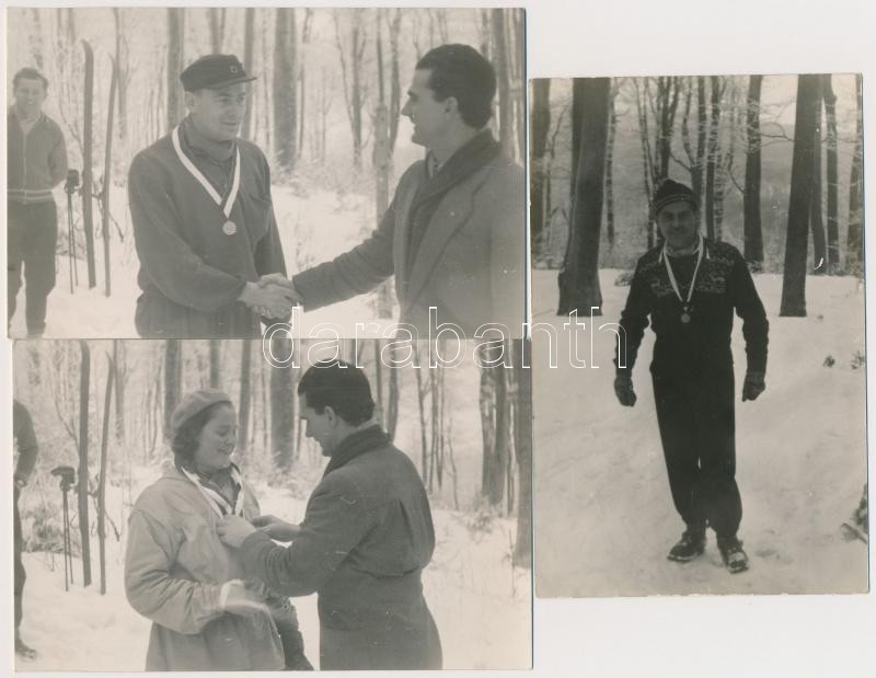 1951 Magyar téli műlesikló, sífutó és síugró bajnokság díjkiosztója. Szokolay Tamás, Komáromi Margit, Reményik Dénes, Rimavölgyi Károly, Soós Éva és Gyöngyös Iván díjazottak - 7 db eredeti fotó felvétel / Hungarian winter downhill skiing, cross-country skiing and ski jumping championship. Winners at the awards ceremony - 7 original photos