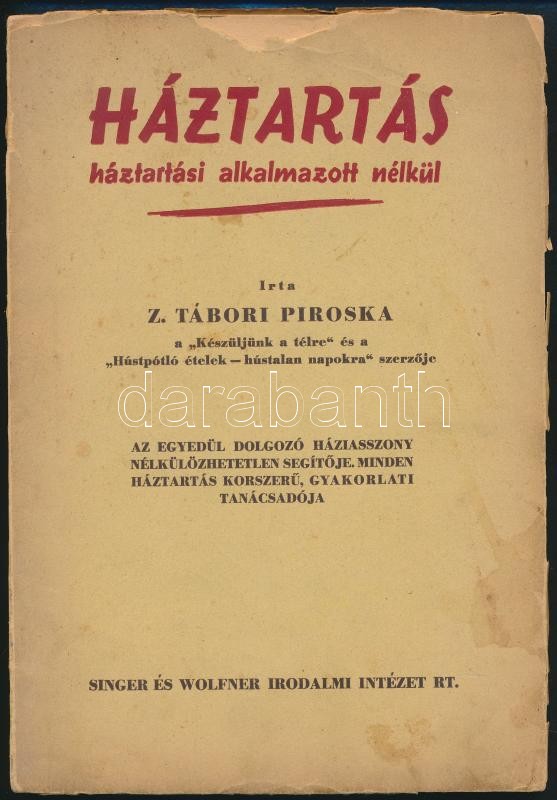 Z. Tábori Piroska: Háztartás háztartási alkalmazott nélkül. Bp.,én.,Singer és Wolfner, 98+2 p. Kiadói papírkötés, szakadozott, foltos borítóval, de belül jó állapotban.
