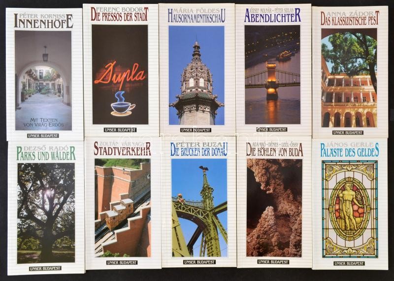 Unser Budapest 10 kötete: Gerle, János: Paläste des Geldes. Radó, Dezső: Parks und Wälder. Zádor, Anna: Das klasszizistische Pest Korniss, Péter: Innerhöfe. Molnár, József-Szilas, Péter: Abendlichter. Adamkó, Péter-Dénes, György-Leél-Őssy, Szabolcs: Die Höhlen von Buda. Buza, Péter: Die Brücken der Donau. Földes, Mária: Hausornamentikschau. Várnagy, Zoltán: Stadtverkehr. Bodor, Ferenc: Die Pressos der Stadt. Bp.,1992-1994,Városháza. Német nyelven. Kiadói papírkötés, jó állapotban.