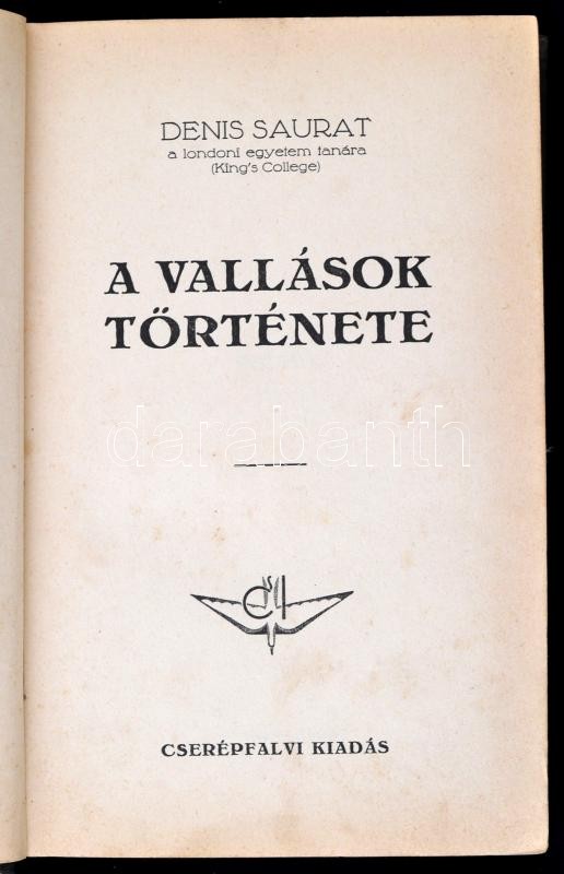 Saurat, Denis: A vallások története. Bp., 1935, Cserépfalvi. Kopott vá... https://www.darabanth.com/hu/338-Gyorsarveres/338.0/Konyvek/Konyvek-Vallas~1500014/Saurat-Denis-A-vallasok-tortenete-Bp-1935-Cserepfalvi-Kopott-vaszonkotesben-jo-alla~II1898753