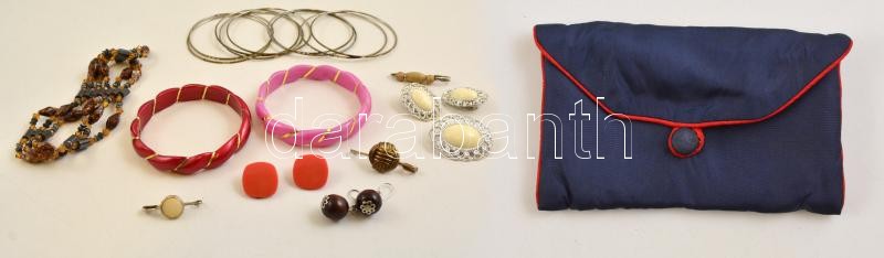 Leírás: Kis bizsu tétel (karperec, mágneses nyaklánc, fülklipsz, stb.) kis borítéktáskában, 10×16 cm