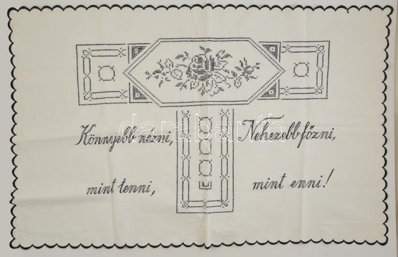 Leírás: "Könnyebb nézni, mint tenni" feliratú hímzett konyhai falvédő, 60×100 cm