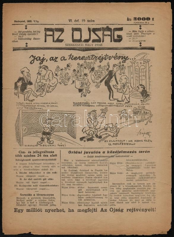 Leírás: 1925 Az Ojság. Nagy Imre jiddis humorban íródott vicclapjának egy száma. kissé szakadozott,