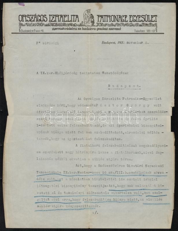 Leírás: 1932 Bp., Az Országos Izraelita Patronage Egyesület gyermekvédelmi és hadiárva gondozó szervezetének fejléces levélpapírjára írt levél