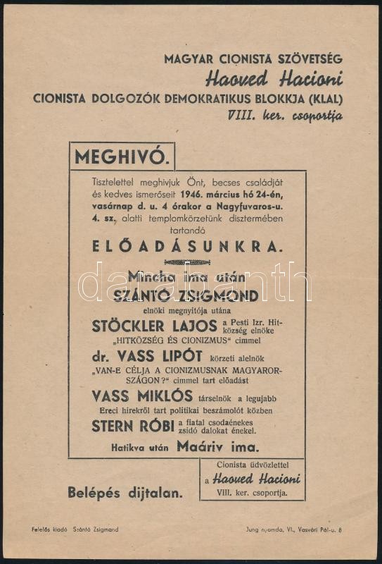 Leírás: 1946 a Magyar Cionista Szövetség meghívója előadásra