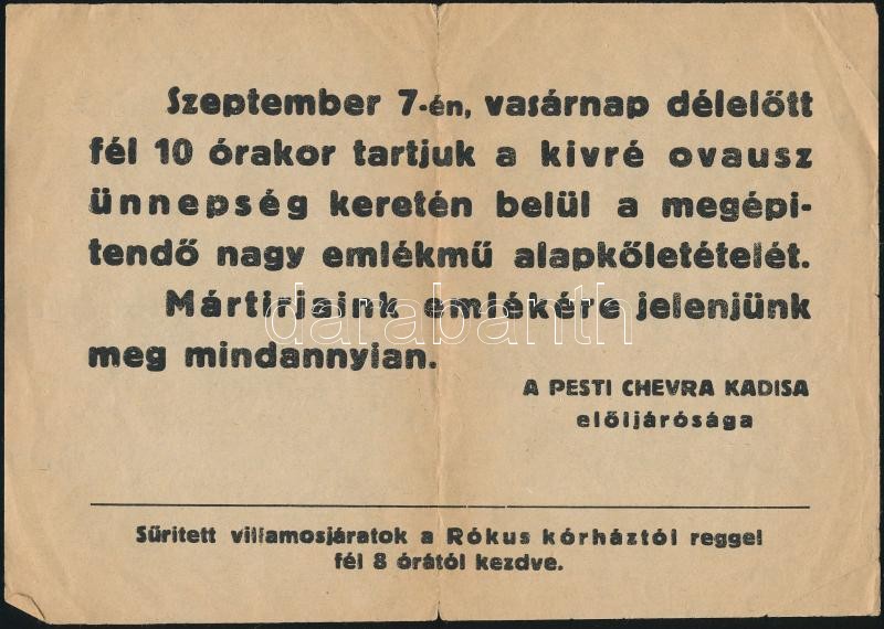 Leírás: A pesti cherva kadisa meghívója emlékmű alapkőletételére