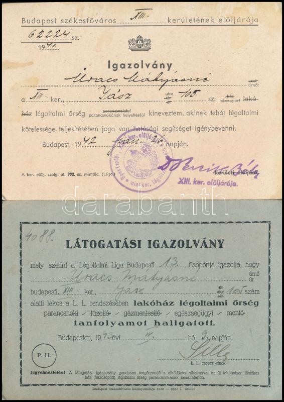 1942-1943 2 db légoltalmi igazolvány: légoltalmi őrség eü. tanfolyamró... https://www.darabanth.com/hu/338-Gyorsarveres/338.0/Mutargy-papirregiseg-egyeb/Militaria~500027/1942-1943-2-db-legoltalmi-igazolvany-legoltalmi-orseg-eu-tanfolyamrol-illetve-legoltalmi-C5~II1900332