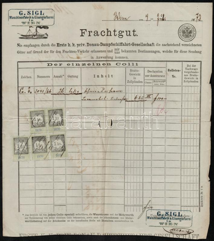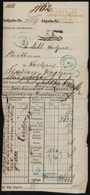 Leírás: 1873 A DDSG Dunadai Gőzhajózási Társaság fuvarlevele a Gönyű haj ó pecsétjével / Bill of fright of DDSG Steamship Company ship Gönyü