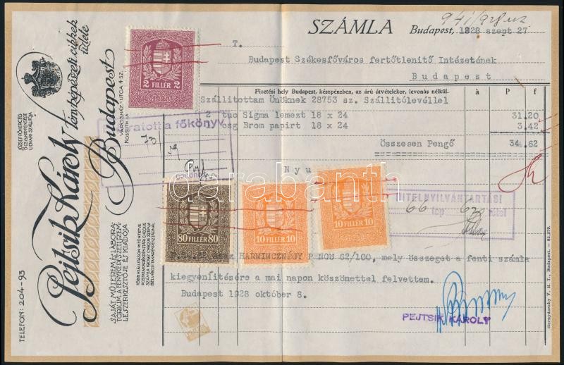 Leírás: 1928 Bp., Pejtsik Károly fényképészeti cikkek üzletének fejléces számlája okmánybélyegekkel