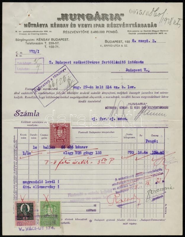 1928 Bp. V., "Hungária" Műtrágya Kénsav és Vegyi Ipar Részvénytársaság... https://www.darabanth.com/hu/338-Gyorsarveres/338.0/Mutargy-papirregiseg-egyeb/Okmanyok~500017/1928-Bp-V-Hungaria-Mutragya-Kensav-es-Vegyi-Ipar-Reszvenytarsasag-fejleces-szamlaja~II1899613