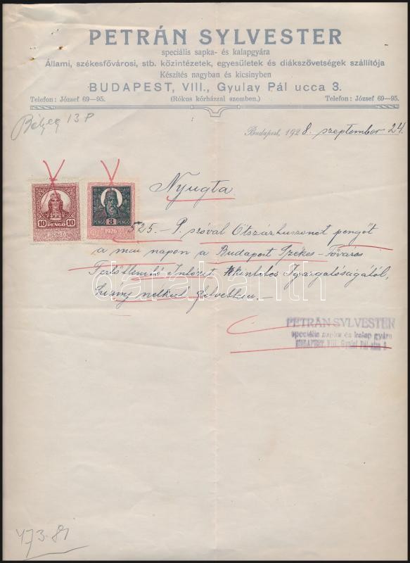Leírás: 1928 Bp. VIII., Petrán Sylvester speciális sapka- és kalapgyára fejléces számlája, okmánybélyegekkel