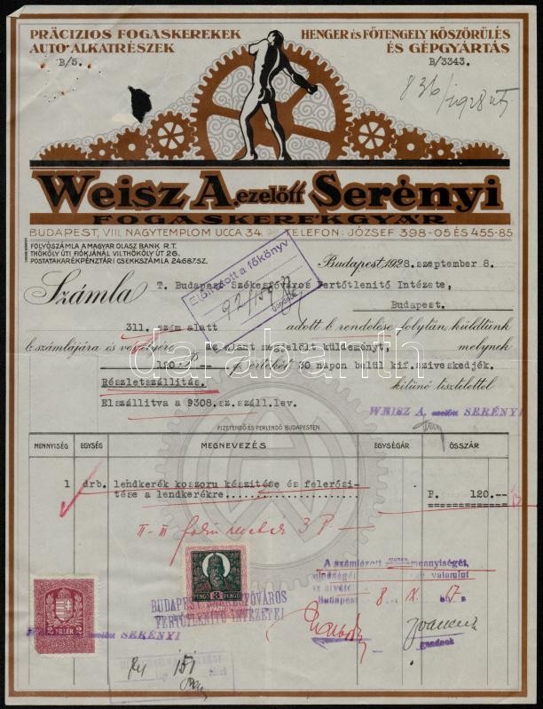 Leírás: 1928 Bp., Weisz A. ezelőtt Serényi fogaskerékgyár díszes fejléces számlája okmánybélyegekkel
