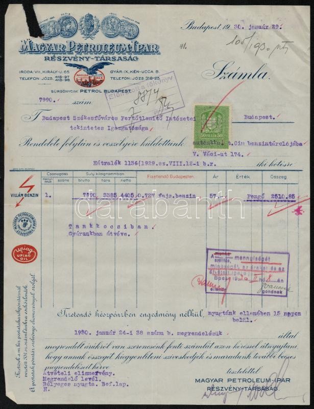 Leírás: 1930 Bp., Magyar Petroleum-Ipar Részvénytársaság díszes fejléces számlája okmánybélyegekkel, kis hiánnyal